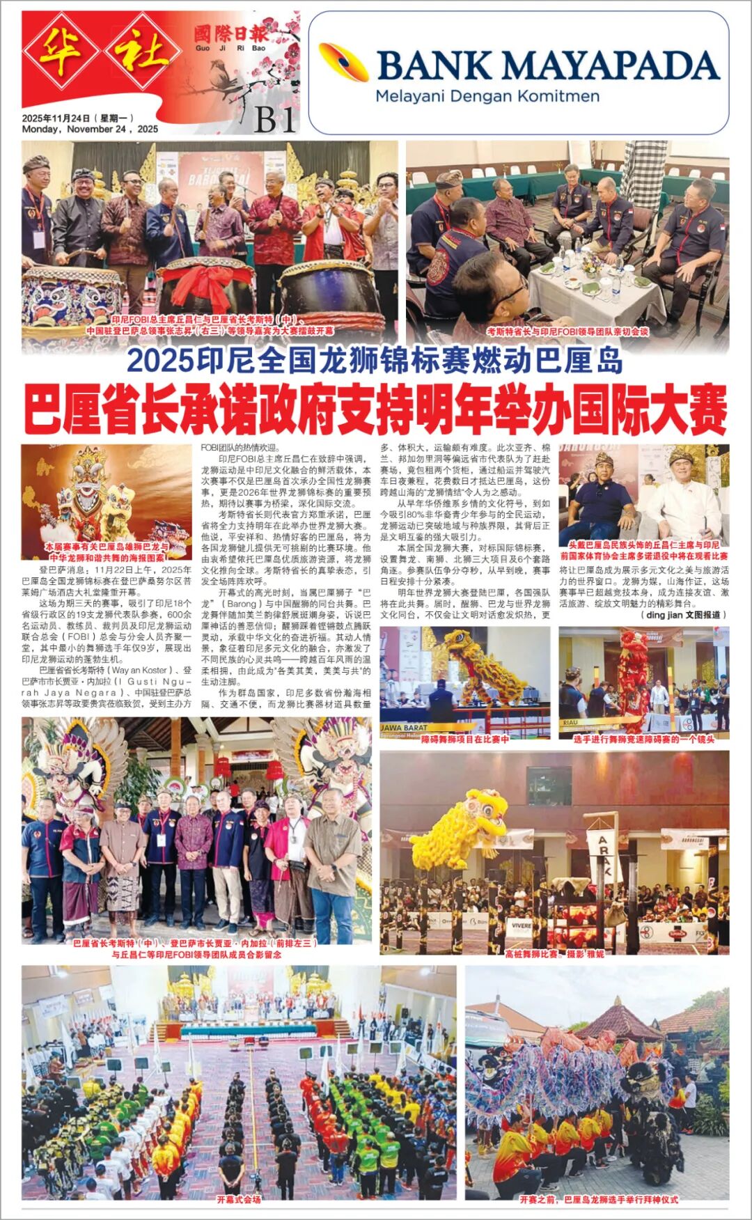 考斯特省长则代表官方郑重承诺,巴厘省将全力支持明年在此举办世界龙狮大赛。他说,平安祥和、热情好客的巴厘岛,将为各国龙狮健儿提供无可挑剔的比赛环境。他由衷希望依托巴厘岛优质旅游资源,将龙狮文化推向全球。考斯特省长的真挚表态,引发全场阵阵欢呼。