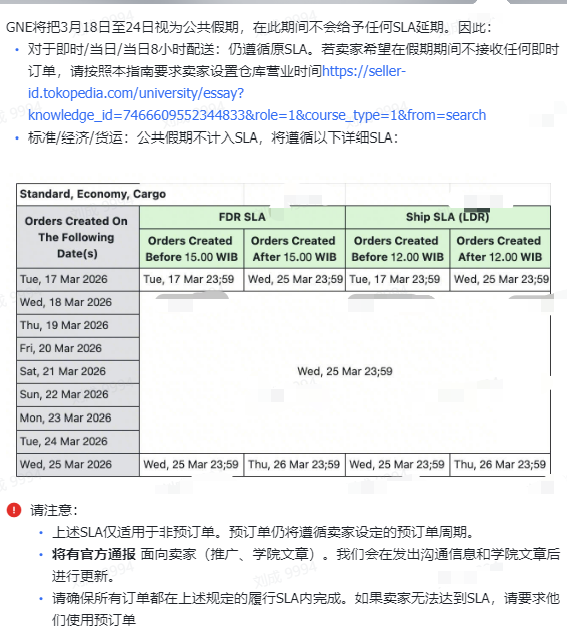 与此同时,Tokopedia 也发布相关政策,3 月 18 日 - 24 日公共假期对标准 / 经济 / 货运类订单不计入 SLA,履约截止时间顺延至 3 月 25-26 日,仅即时 / 当日 / 8 小时配送未作时效延长,卖家可手动设置仓库营业时间规避接单。